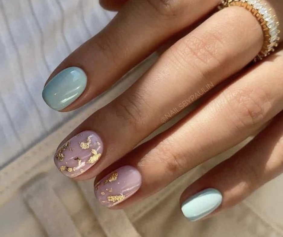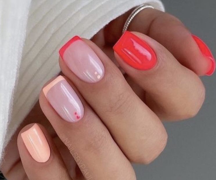 Színes francia köröm, tejes alapok, minimalista minta: pötty, vékony vonalak, pici arany díszítés. És a körömösszehangolása a nyári outfittel vagy lábkörmökkel